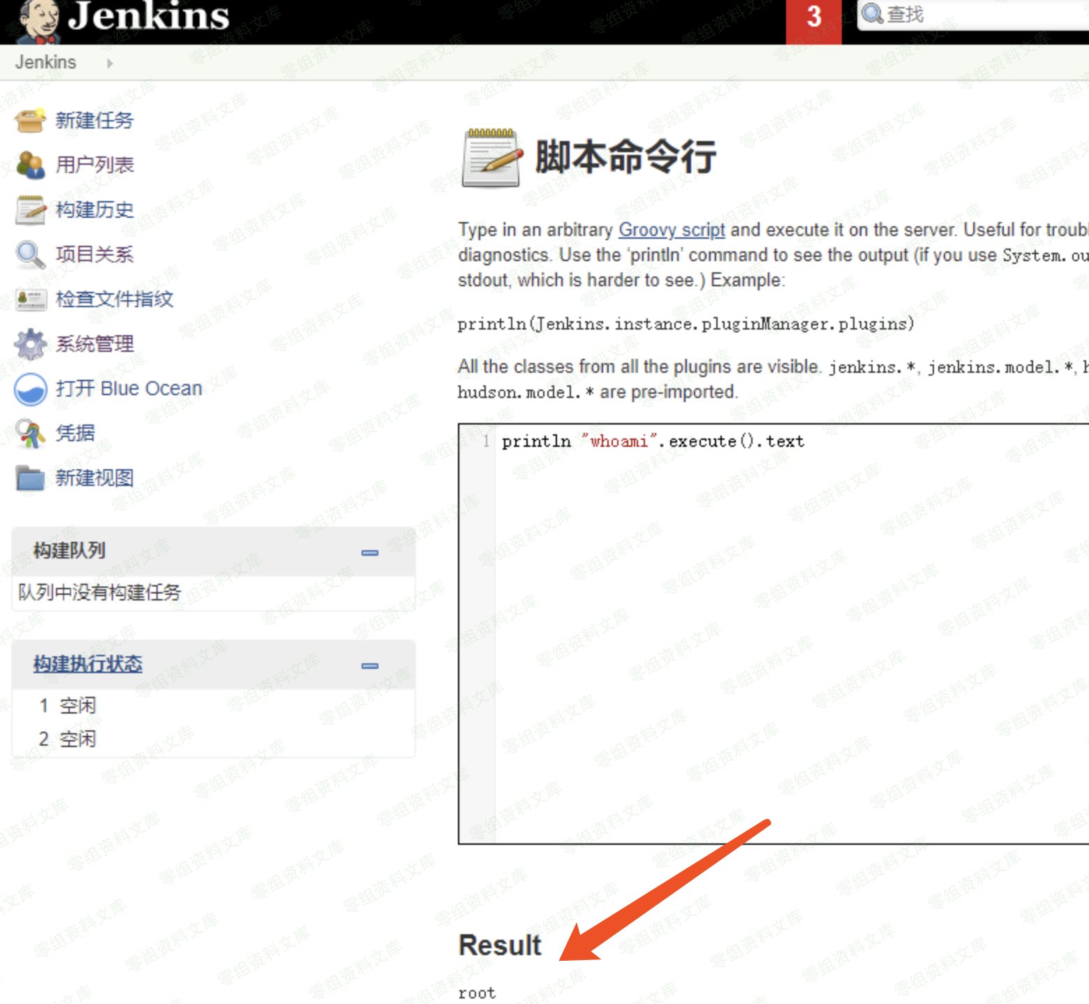 Jenkins管理登陆之后,后台”系统管理”功能,有个”脚本命令行的”功能,它的作用是执行用于管理或故障探测或诊断的任意脚本命令,利用该功能,可以执行系统命令,该功能实际上Jenkins正常的功能,由于很多管理账号使用了弱口令,或者管理后台存在未授权访问,导致该功能会对Jenkins系统服务器产生比较严重的影响和危害。