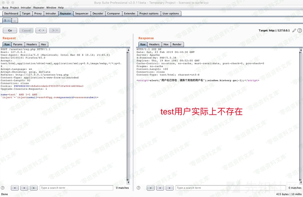 当前页面无输出点,只是返回一个注册/未注册(通过if判断true或者false),可以使用布尔盲注来解决这个问题