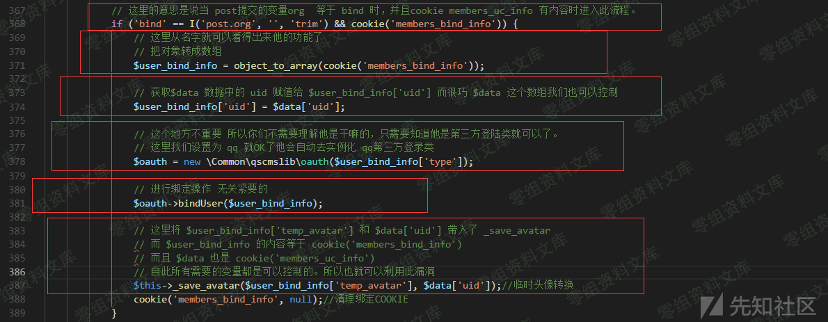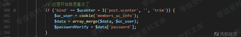 post的变量ucenter为bind时,则通过cookie获取数组\$uc\_user接着会进行数组合并而members\_uc\_info的cookie值是可控的,所以\$data也是可控的。