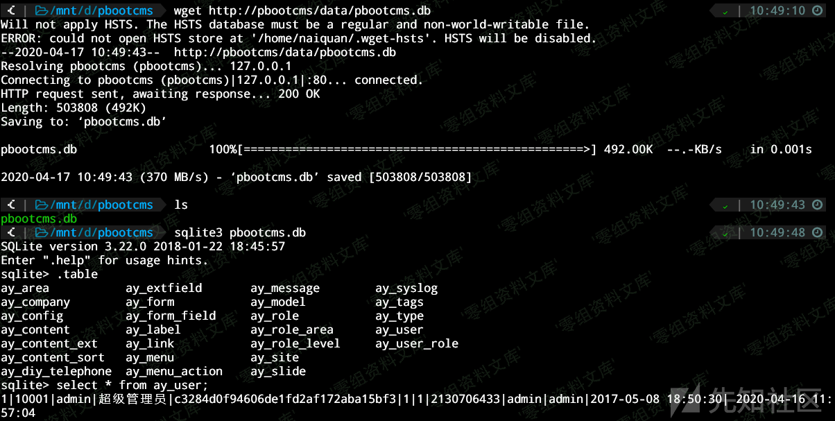 下载后用`sqlite3`打开就可以得到用户的hash,hash使用的是`md5(md5($pass))`生成的。