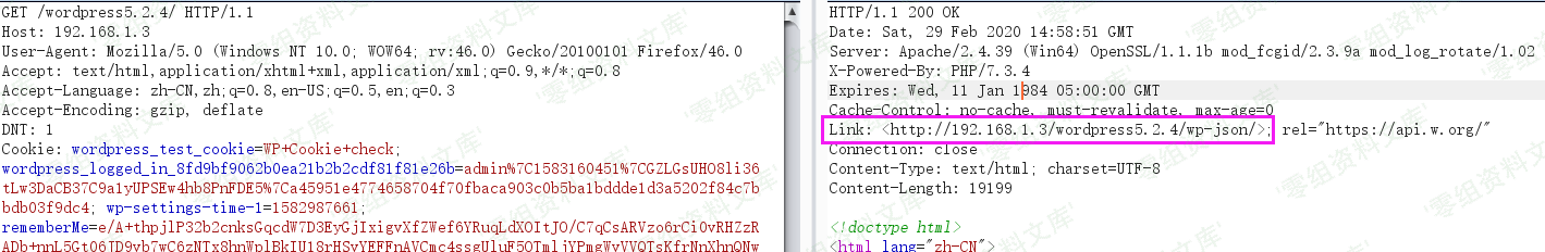 2、然后发送到reapeter,日常go一下,看到返回包内容,返回了/wp-json