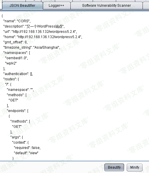 3、我们将请求包中的url补上/wp-json,再次发包,发现出现了一堆json数据,我们将其复制到jsonbeautiful进行格式化,说明漏洞出现在:[http://www.0-sec.org/wp-json,](http://www.0-sec.org/wp-json,)