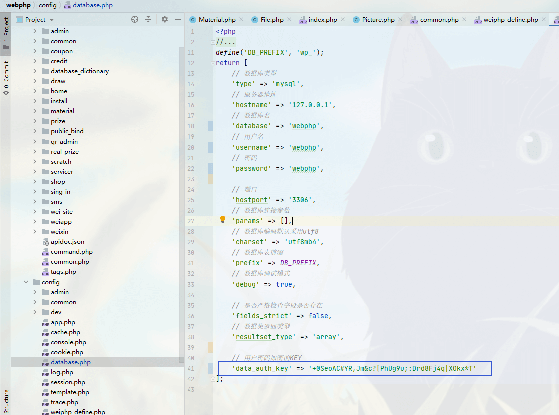 得到這個配置文件可參考 [https://www.pwnwiki.org/index.php?title=CNVD-2020-68596_Weiphp5.0_%E5%89%8D%E5%8F%B0%E6%96%87%E4%BB%B6%E4%BB%BB%E6%84%8F%E8%AE%80%E5%8F%96%E6%BC%8F%E6%B4%9E CNVD-2020-68596 Weiphp5.0 前台文件任意讀取漏洞]