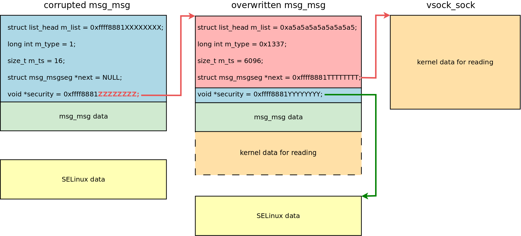 The original msg_msg is overwritten by controllable data, and the msg_msg.next pointer stores the address of the vsock_sock object;