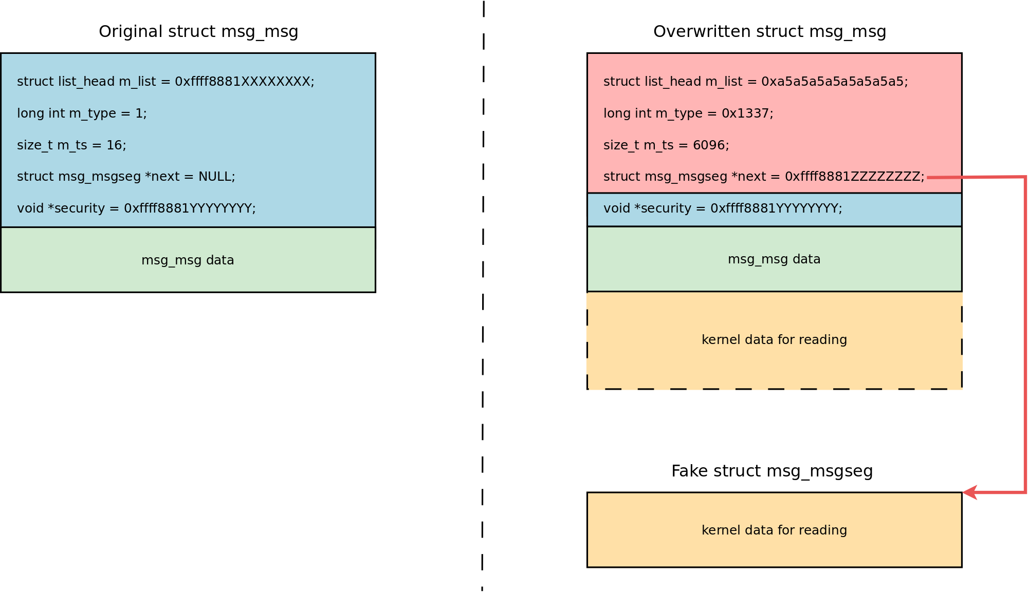 內核實現的System V消息有限制最大值DATALEN_MSG,即PAGE_SIZE減去sizeof(struct msg_msg))。如果你發送了更大的消息,剩餘的消息會被保存在消息段的列表中。 msg_msg中包含struct msg_msgseg *next用於指向第一個段,size_t m_ts用於存儲大小。當進行覆蓋操作時,就可以把受控的值放在msg_msg.m_ts和msg_msg.next中: