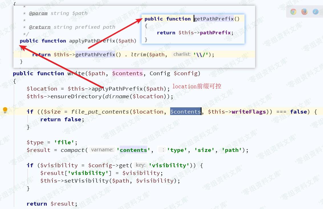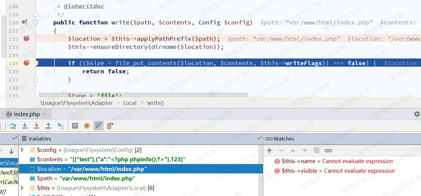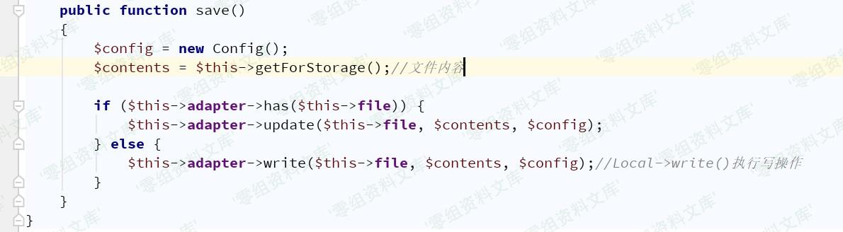 接下来需找到具有write()方法的类,`vendor/league/flysystem/src/Adapter/Local.php`中Local类符合条件