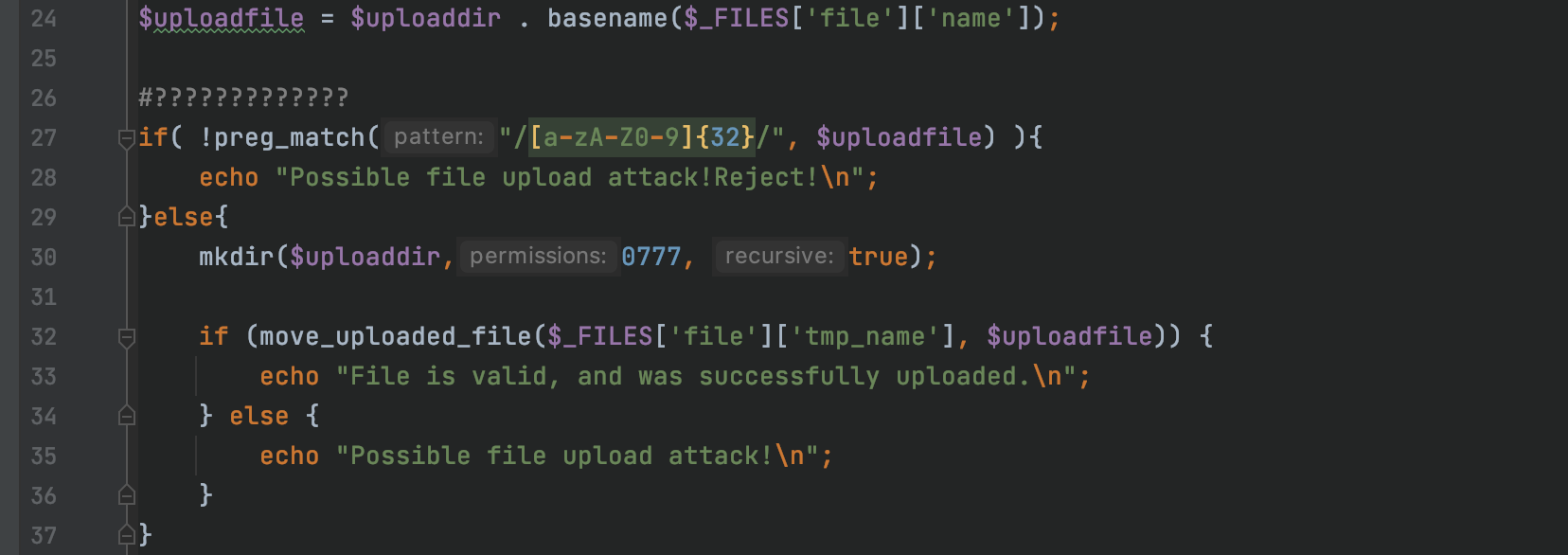在第27行中,使用preg_math进行一次正则匹配。要求上传的文件名必须已`/A-z/*32`位字符的格式。