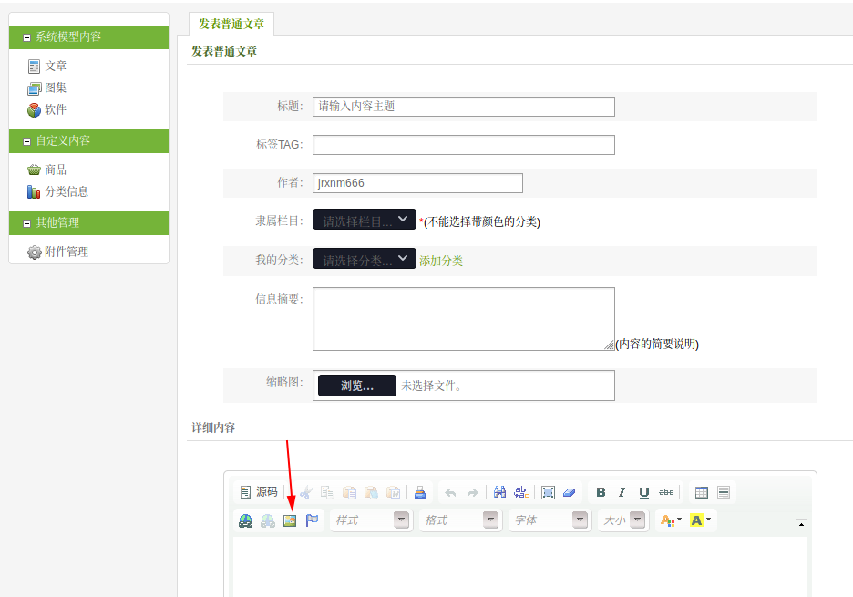 登录并进入 `member/article\_add.php` 发布文章,选择下面的富文本编辑器插入图片  选