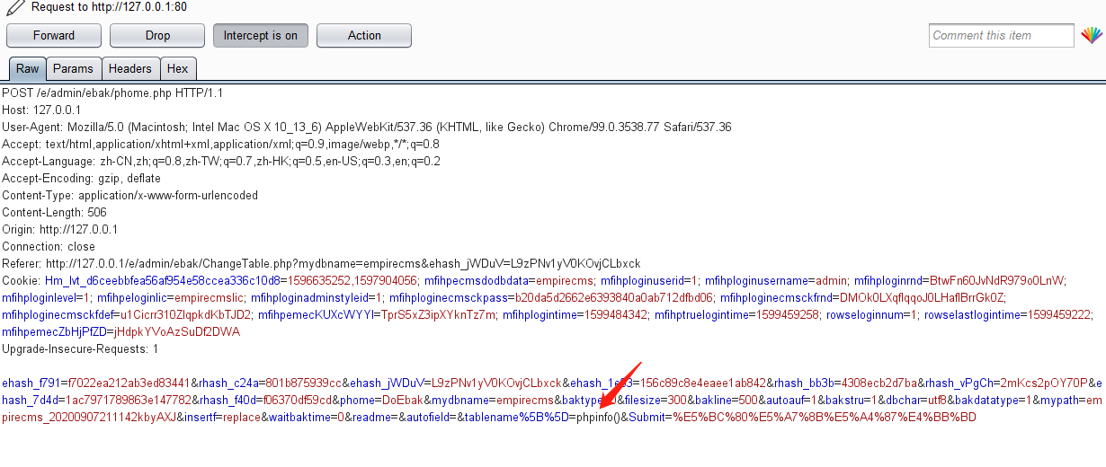 需要有后台权限。 1.登入后台管理页面 2.点击系统->备份->备份数据  3.随便选择一个表,点击最下面的开始备份,抓包  4.抓包后修改tablename字段为命令执行语句  5.返回页面  6.访问备份路径下config.php亦可  7.查看config.php,命令已经写进去了