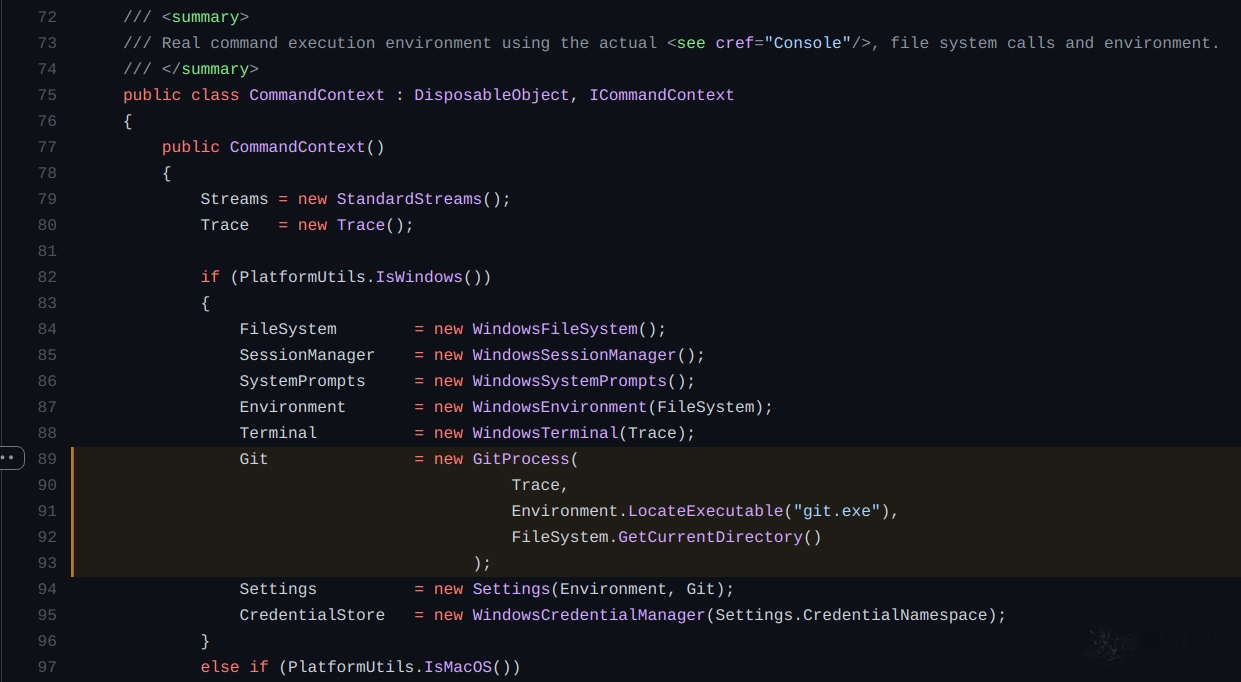 第89行中,将创建一个搜索git.exe的新进程,并将Environment.LocateExecutable(‘git.exe’)作为目录路径参数传递给GitProcess()函数。