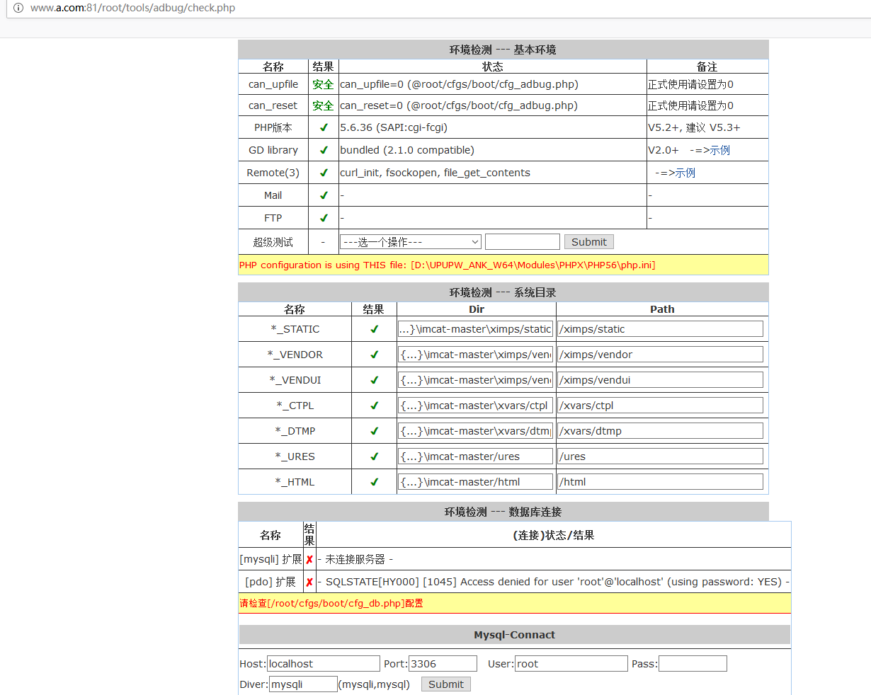 imcat是一套基于PHP的开源建站系统。 imcat 4.4版本中存在安全漏洞。远程攻击者可借助root/tools/adbug/check.php URI利用该漏洞获取敏感的配置信息。