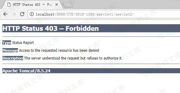 Apache Tomcat < 9.0.5 Apache Tomcat < 8.5.28 Apache Tomcat < 8.0.50 Apache Tomcat < 7.0.85 ### 三、复现过程 Java EE 提供了类似 ACL 权限检查的ServletSecurity注解,可以用于修饰Servlet对其进行保护,如果有两个servlet,Servlet1,访问路径为“/servlet1/”并且添加了ServletSecurity注解,Servlet2,访问路径为“/servlet1/servlet2/”但没有ServletSecurity注解,首次访问servlet1/servlet2,servlet1的ServletSecurity注解并不会生效,无法保护“/servlet1/servlet2”路径,因此可能会导致未授权访问。 如果在访问“/servlet1/servlet2”之前先访问过“/servlet1”,Tomcat会加载ACL并启动对“/servlet1/servlet2”的保护,则漏洞不会触发。  在Servlet1前加上ServletSecurity注解,Servlet2无此注解。  将web.xml文件中servlet相对应的url-pattern修改为如下图所示后。  运行该项目。首次访问servlet2的URL,发现可以未授权访问,针对servlet1的ACL并未生效。 `http://localhost:8080/CVE-2018-1305/servlet1/servlet2/`  第二次访问servlet1的URL,访问被禁止,此时ACL生效。 `http://localhost:8080/CVE-2018-1305/servlet1/`  再次访问servlet2的URL,发现访问被禁止,如果ACL对servlet2生效,必须建立在servlet1被访问过的前提下。 `http://localhost:8080/CVE-2018-1305/servlet1/servlet2/`  #### 漏洞演示  因此漏洞的复现仅限于Tomcat启动后,在访问“/servlet1/”之前先访问了“/servlet1/servlet2/”页面,若之前存在任何人访问“/servlet1/*”页面,则漏洞不会触发。漏洞危害较高,但是利用条件困难,因此影响范围并不大。 参考链接 http://cve.mitre.org/cgi-bin/cvename.cgi?name=CVE-2018-1305 http://blog.nsfocus.net/cve-2018-130-handling/ https://www.anquanke.com/post/id/99213