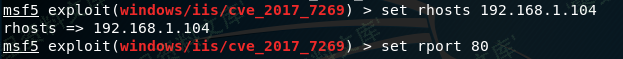 msf5 > set rhosts 192.168.1.104 // 设置目标的IP