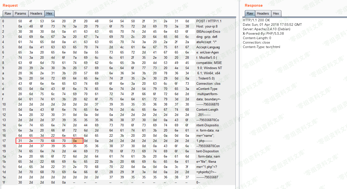 在1.php后面插入一个\x0A(注意,不能是\x0D\x0A,只能是一个\x0A),不再拦截: