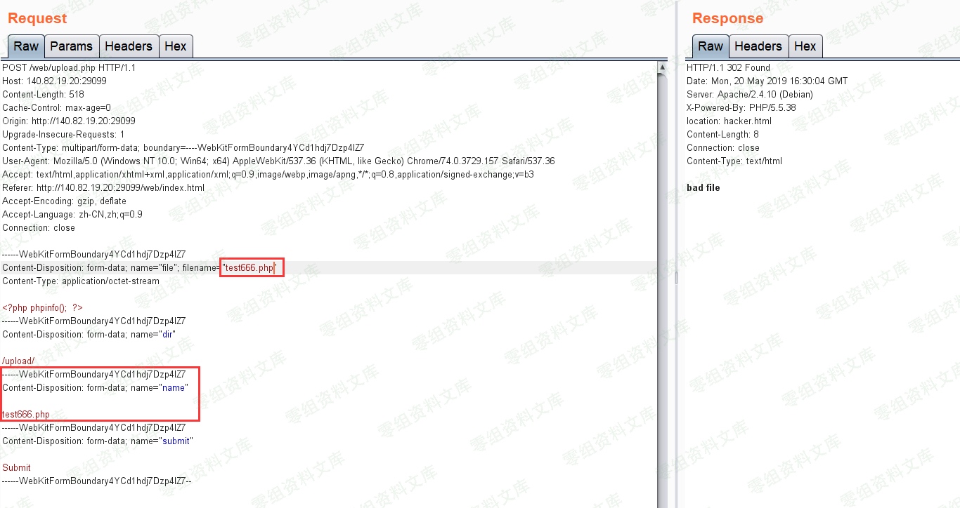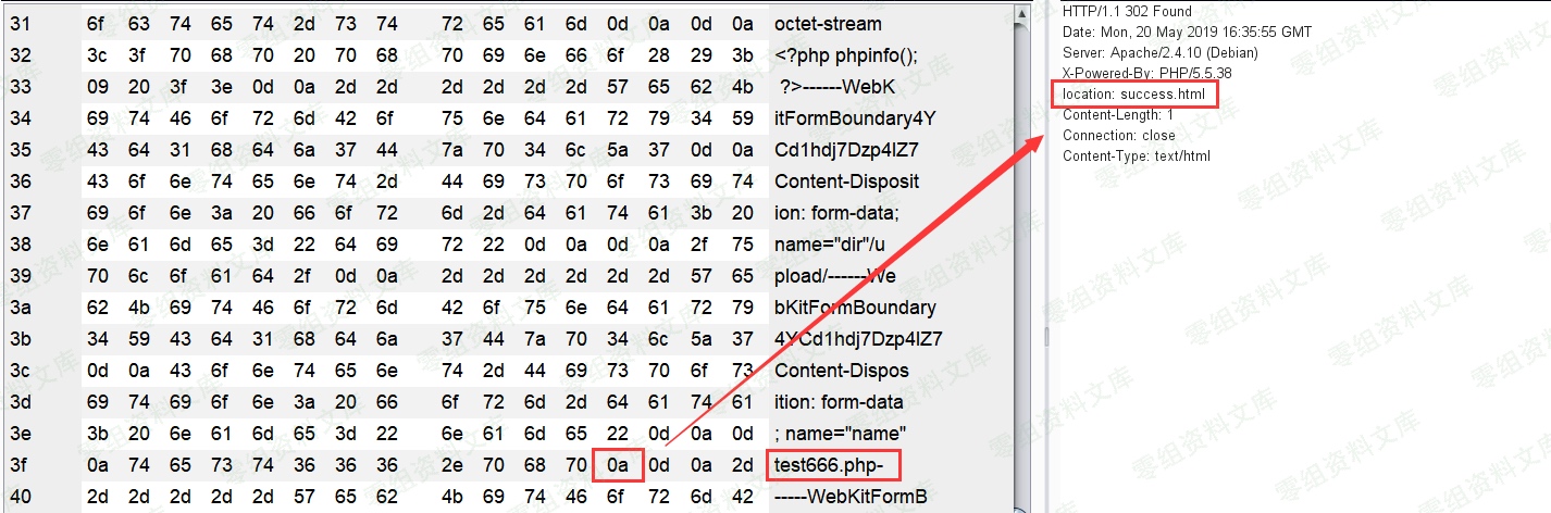 但是我们在请求包中还可以看到一个参数`dir = /upload/`,所以猜测上传目录为`·/upload/test666.php%0a`