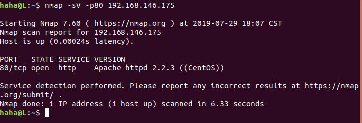 `nmap -sV -p80 192.168.146.175` (用nmap查看Apache版本)(Apache2.2.3初步断定存在漏洞)