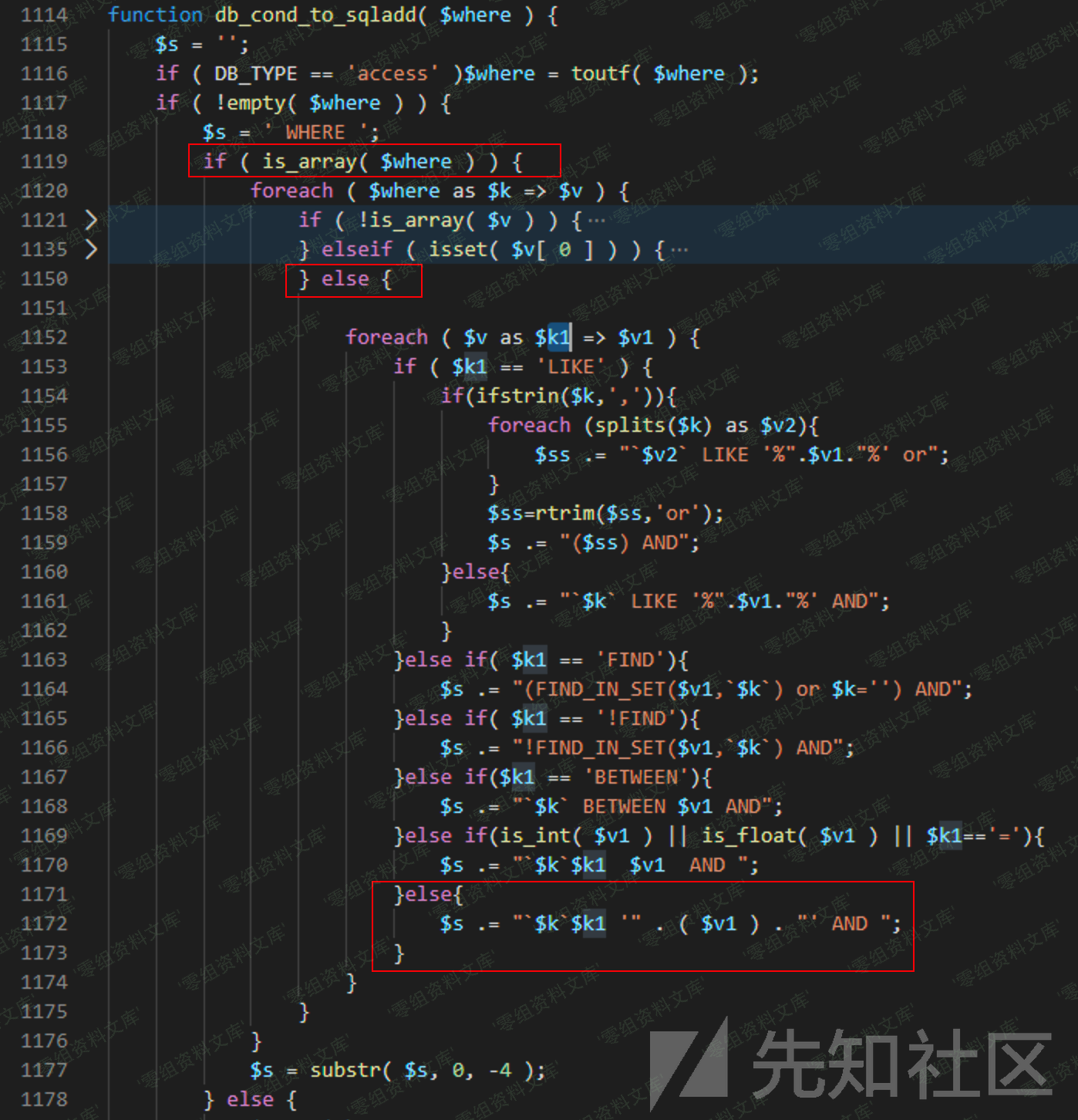 这里继续看db_cond_to_sqladd函数部分,该函数代码部分比较长(70行),但只需要着重看其中几个处理分支即可。注入点传入的条件变量是数组,自然进入下面的第一个红框控制流中。接着,假如传入的参数id也是数组并且不存在key为0的元素,那么会进入第二个红框控制流中。