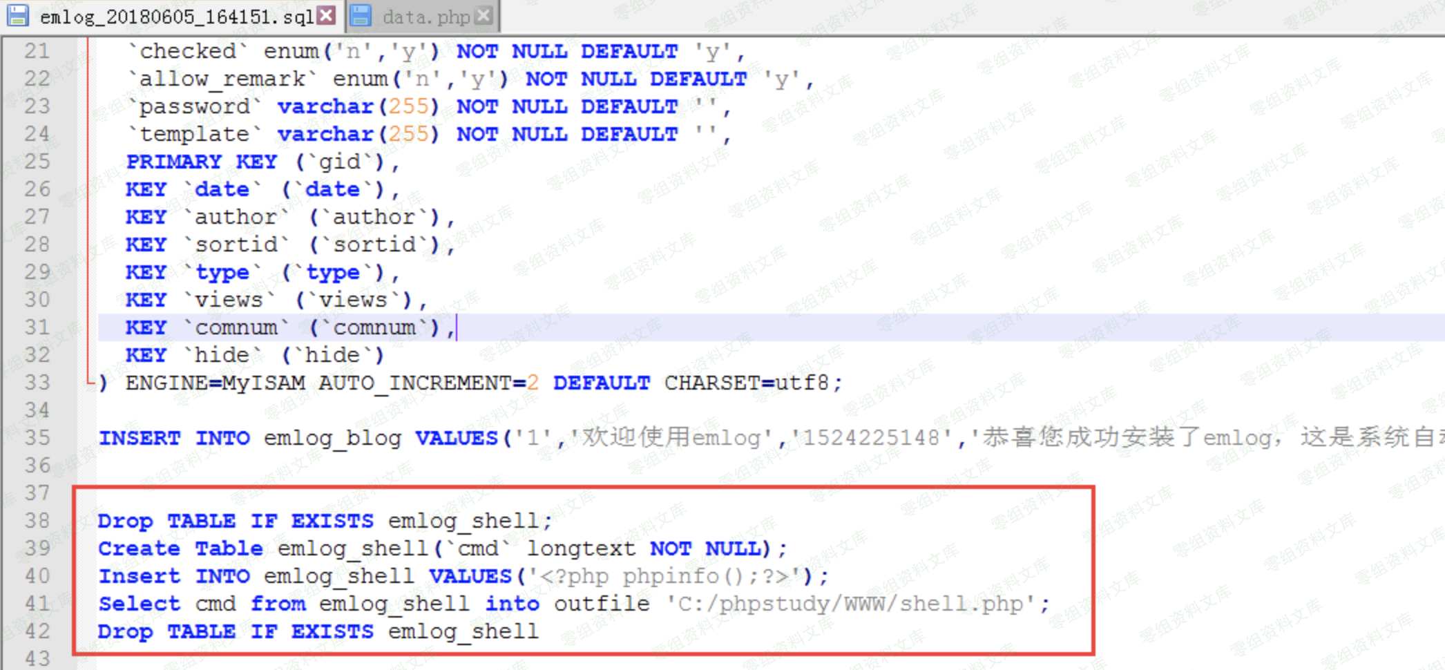 Emlog<=6.0 ### 三、复现过程 备份数据库到本地:  修改数据库文件,将备份的数据库文件进行修改,在最后一段添加上自己构造的SQL语句:  这一段sql语句主要功能是:首先判断是否存在emlog_shell数据表,如果存在则删除该表,之后创建一个新的emlog数据表,之后再向该表中添加信息(这里可以填入一句话木马),之后使用s`elect..... into outfile ....`将数据表中的表项内容读入到一个shell.php的PHP文件汇总,之后再删除该数据表! 导入数据库:  之后访问之: