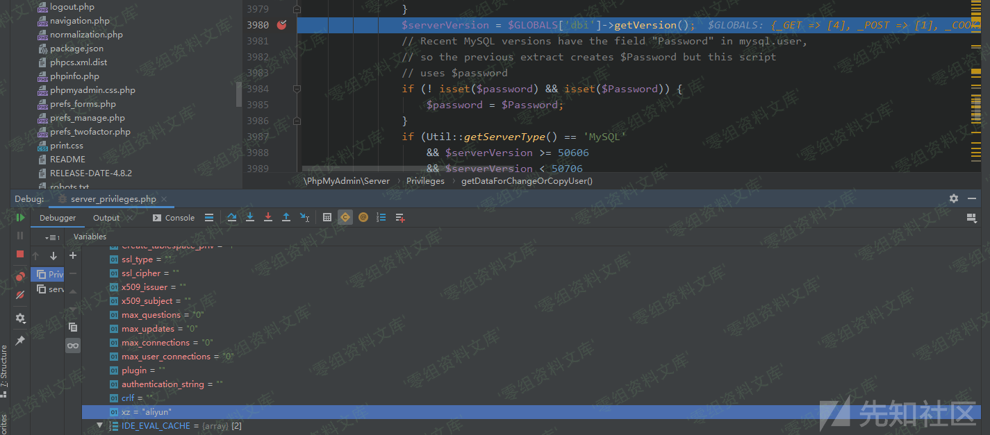 在/libraries/classes/Server/Privileges.php::3980下断点