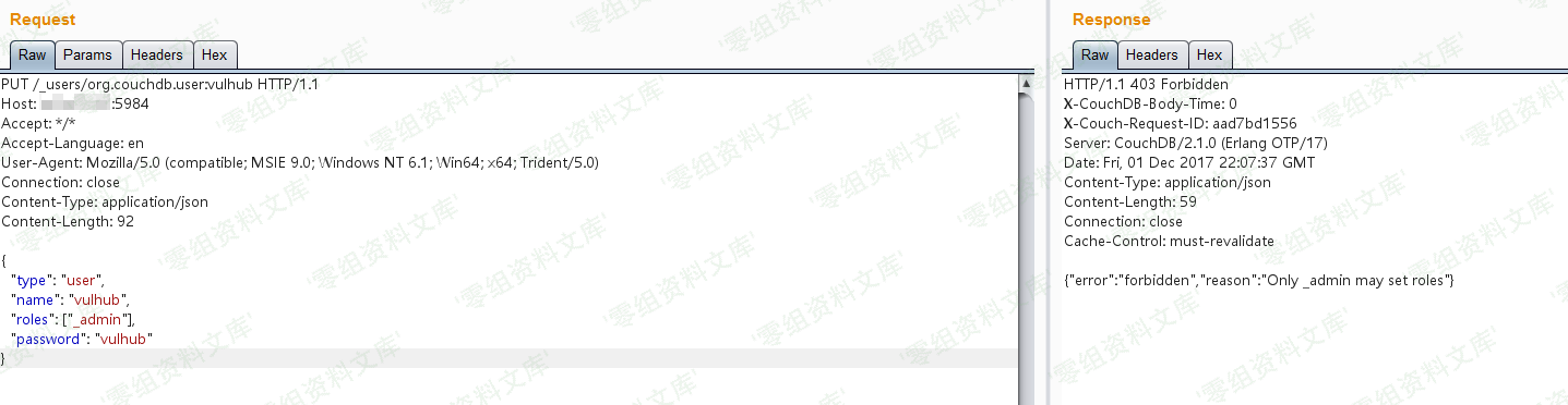 可见,返回403错误:`{“error”:”forbidden”,”reason”:”Only _admin may set roles”}`,只有管理员才能设置Role角色: