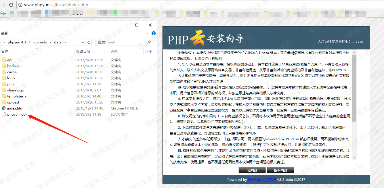 取得路径应该是 根目录/install/,按照上图的路径创造的lock文件应该是放至于 根目录/data/phpyun.lock。