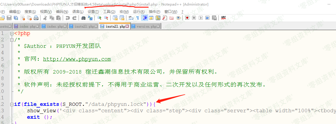 取得是当前文件的绝对路径。拼接起来,检测的lock文件位置应该是 根目录/install/data/phpyun.lock。