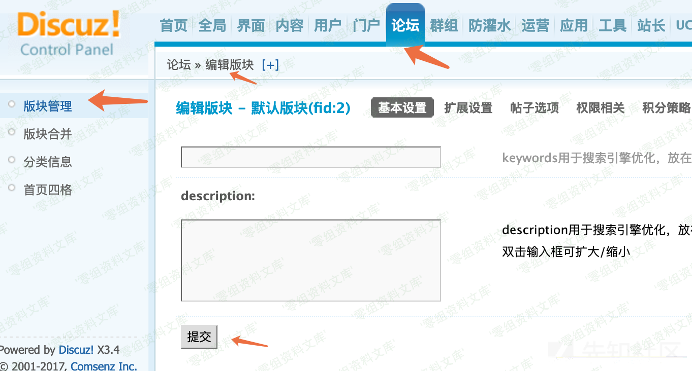登陆后台,进入论坛->模块管理->编辑板块,使用burp拦截提交的数据。