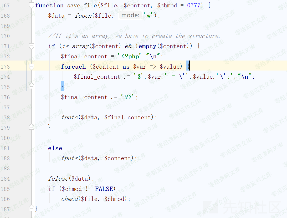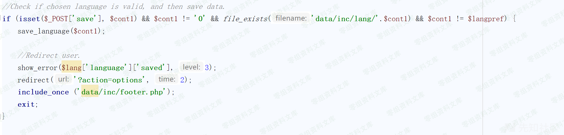 Pluck CMS Pluck CMS <=4.7.10 ### 三、复现过程 1、分析过程 目前最新版本为4.7.10,个人测试github上最旧的4.7.2版本仍然存在该漏洞,框架本身语言选择模块数据注入导致的文件包含漏洞,官方更新版本并没有对这部分代码进行修改,可以认为是全版本通用的。该漏洞是在复现"我怎么这么帅"在先知发表的《Pluck CMS 4.7.10远程代码执行漏洞分析》之余审计其他代码发现的,在此致谢。 v4.7.1分析 从入口文件admin.php查看:  查看language.php,满足指定的文件存在,并传入的cont1参数和原本设置的$langpref参数不等,进入save_language($cont1)。  调用save_file方法。  由于只有一个数据,直接182写入php文件。  至此,langpref的值变成可控值,这个值对应的文件,用于控制网站的语言选择,会自动被全局php文件包含。可以包含上传功能点上传的图种文件解析其中的一句话导致getshell。文件上传功能点使用白名单,但是没有进行重命名,所以路径可以简单猜解。  ## 2、复现过程 文件上传一个可以写一句话木马的php图种。   上述参数保存于php文件: ``` \data\settings\langpref.php ```  由于该参数是网站语言控制的php文件,访问任意网页,包含langpref对应的文件。  访问生成的php一句话木马。