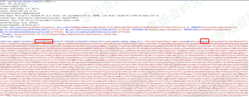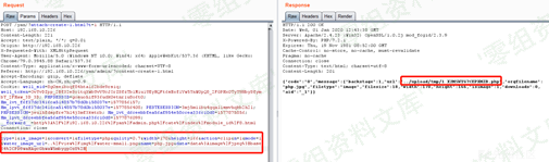 第三步,修改post包中“filetype”参数类型为“php”;经分析 “data”参数为base64加密,这里我们将测试数据“”经过base64加密等构造,形成“data”参数的数据:data%3Aimage%2Fjpeg%3Bbase64%2CPD9waHAgcGhwaW5mbygpOz8%2B,最后数据包放行,返回成功上传为php文件的路径: