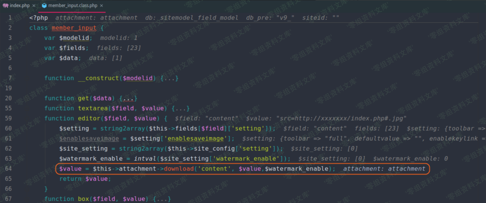 看了一下 member_input 类的所有方法,只有一个 editor 方法比较好利用,而本次漏洞正是利用到这个方法。在这个方法中,调用了 attachment 类的 download 方法。(下图对应文件位置:caches/caches_model/caches_data/member_input.class.php)