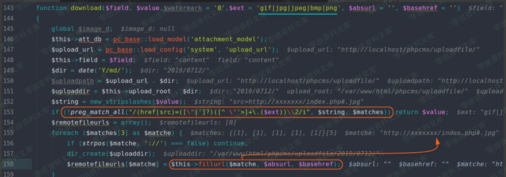 在 download 方法中,程序先使用正则对图片 URL 进行匹配,其中 `$ext` 只允许为`gif|jpg|jpeg|bmp|png` ,而我们使用 `http://xxxx/1.php?a.jpg` 或者 `http://xxxx/1.php#a.jpg` 即可绕过正则。(下图对应文件位置:phpcms/libs/classes/attachment.class.php)