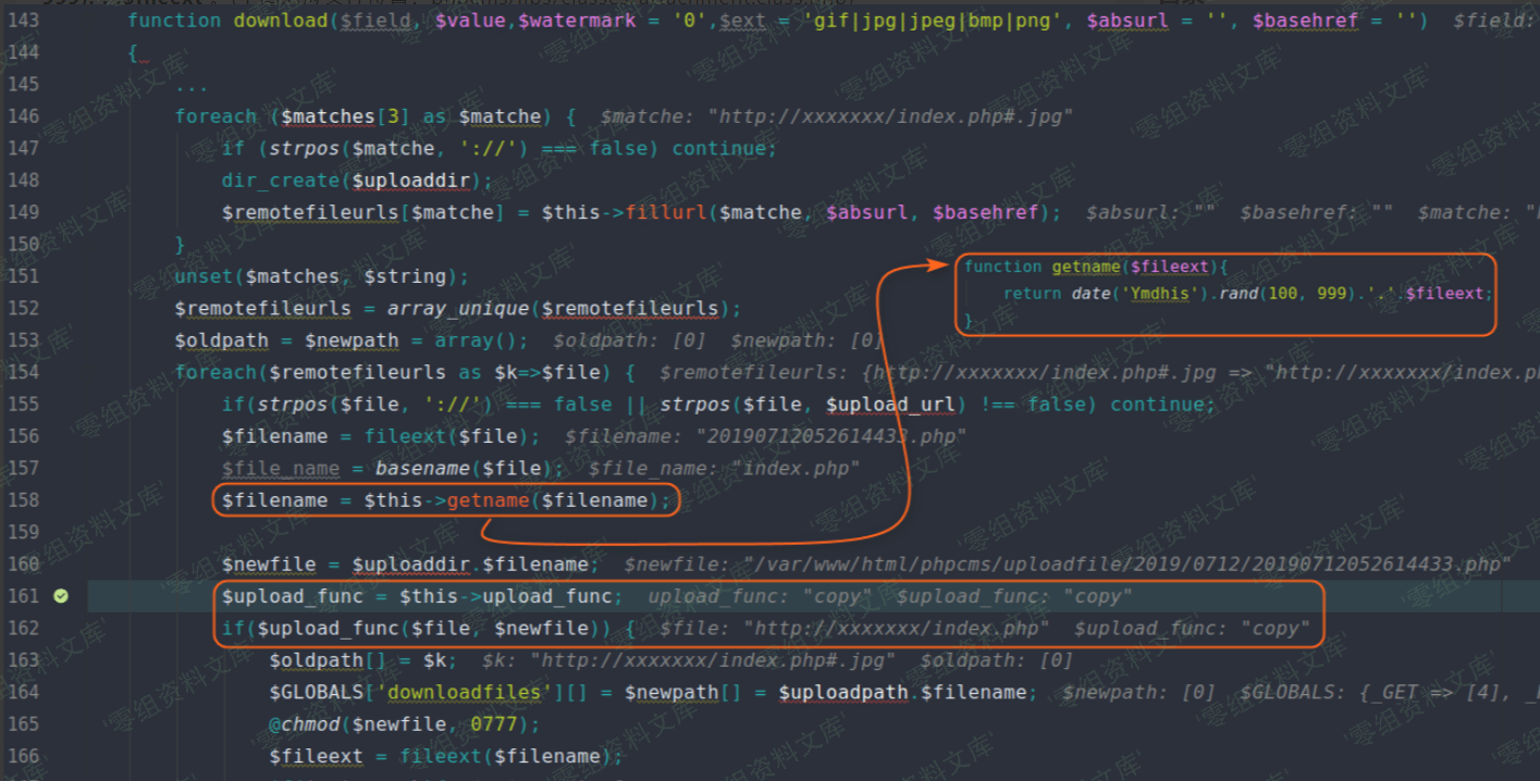 fillurl 方法处理后,又回到了 download 方法。程序直接调用 copy 函数将远程文件复制到本地(对应下图 161 行代码),远程文件名可预测,后缀名为上边处理后的 URL 文件名后缀,即 php ,最终导致 getshell 。其中 webshell 地址为 `http://website/uploadfile/date(‘Y/md/’)/date(‘Ymdhis’).rand(100, 999).’.’.$fileext` 。(下图对应文件位置:phpcms/libs/classes/attachment.class.php)
