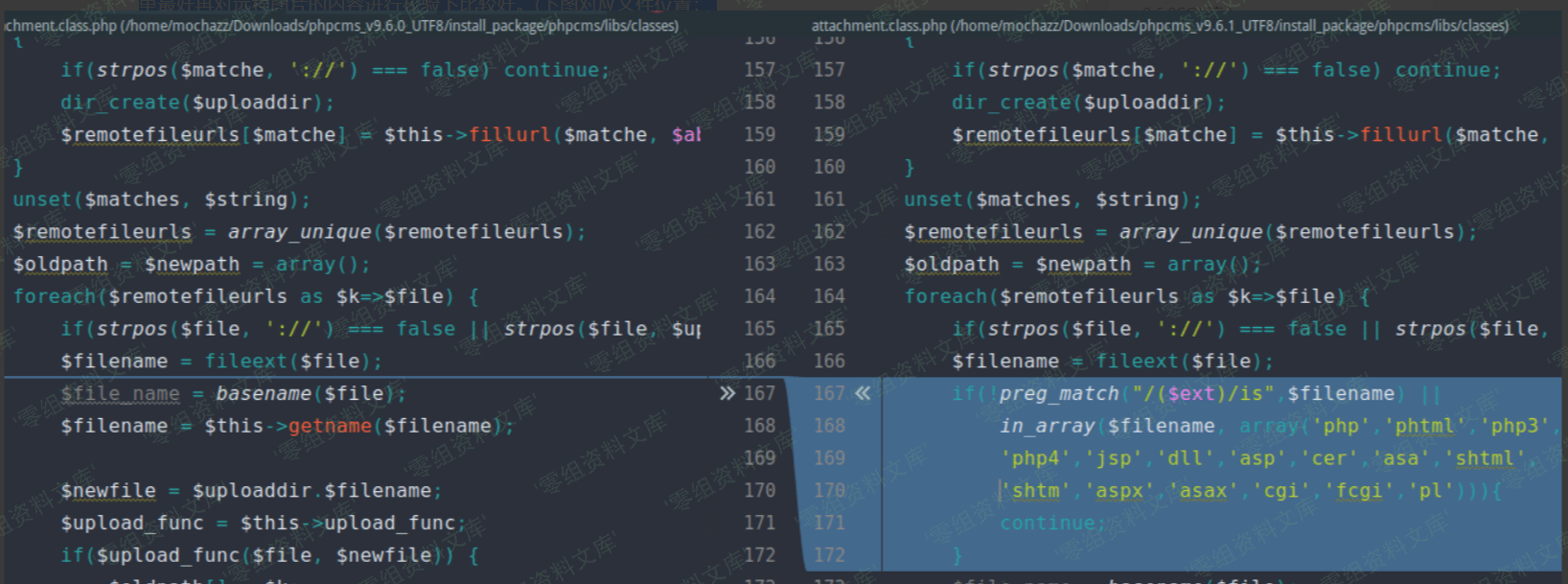 最后我们再来看一下在官方发布的 PHPCMS v9.6.1 中是如何修复这个漏洞的,代码具体如下。可以明确看到,在官方补丁中,对 `fileext($file)` 获取到的文件后缀进行了黑名单校验。虽然暂时不能直接上传 shell ,但是还是可以上传图片马。如果 CMS 存在任意文件包含或任意文件名修改的漏洞,同样还是可以 getshell ,这里最好再对远程图片的内容进行校验下比较好。(下图对应文件位置:phpcms/libs/classes/attachment.class.php,左半图为PHPCMSv9.6.0,右半图为PHPCMSv9.6.1)