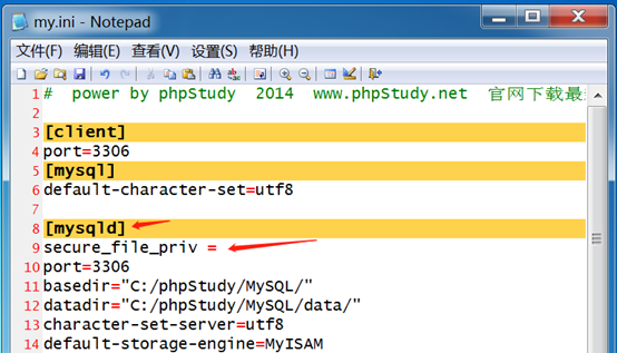 修改`mysql.ini` 文件,在`\[mysqld\] `下添加条目: `secure\_file\_priv =`,保存然后重启phpstudy,不然用mysql写入文件会报错。