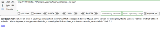 在用户名处输入单引号,报错,说明存在sql注入漏洞
