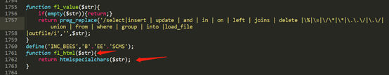跟进`f1\_html`函数,发现使用`htmlspecialchars`函数对输入的特殊符号进行`html`实体化转义,主要用于防御XSS漏洞