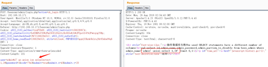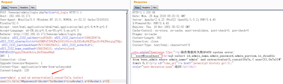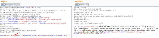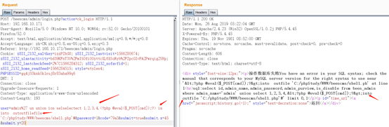 在burpsuit抓包,修改包并重放,提示如下错误,根据返回的数据包可以看到由于`htmlspecialchars`函数对输入的特殊符号进行html实体化转义,还有就是`into`、`outfile`关键字被过滤