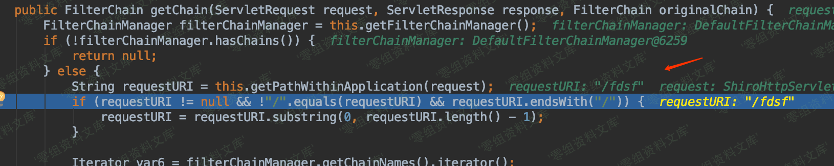 问题同样可以定位到getChain函数中对于requestURI的获取中,如下图所示,`this.getPathWithinApplication(request)`获取的requestURI为/fdsf ,而不是我们输入的`/fdsf;/../hello/1`,从而导致后面的URI路径模式匹配返回False,从而再次绕过了shiro拦截器。